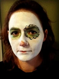 My friend Laura was kind enough to pose for the photos, I think Crime Spree Carol may have something on her as well, after this we'll consider all debts paid in full. In the 1st step I covered Laura's face in the grease paint with a small sponge. I left large areas around her eyes and tip of nose free. If you'd like the makeup to set you can brush on the white face powder next, it will also help the other colors go on smoothly on the top.